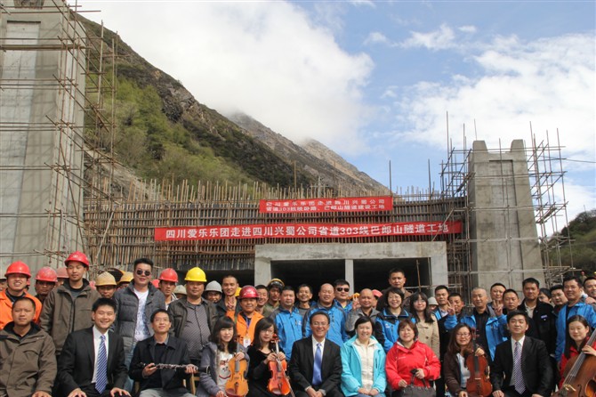 6月4日,"四川愛樂樂團走進四川興蜀公司映臥路、巴郎山隧道工地"在海拔3800米的巴郎山隧道出口激情奏響,受到一線參建者們的熱烈歡迎。到達現(xiàn)場后,演奏家們不顧疲勞,用優(yōu)美的旋律演奏了《窗花舞》、《梁?!?、《在水一方》、《我的太陽》、《藍色多瑙河》、《同一首歌》等經(jīng)典樂曲,其中穿插了巴郎山參建者的自備獨唱節(jié)目《火苗》和現(xiàn)場即興表演等節(jié)目,將演出現(xiàn)場的氛圍推向了高潮,演奏家們敬業(yè)的態(tài)度、務(wù)實的作風(fēng)和精湛的表演才能,使一線參建者們深受感動,為參建者們樹立了榜樣。