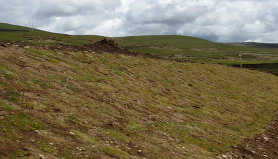 項目填方路段大多穿過高原草旬,為盡可能減少對高原濕地的破壞,理亞路在施工中按照不多占一分地、不修筑臨時便道、不向濕地撒落一粒土石的原則。修筑后的下邊坡先采用用機械進行刷坡,再用人工進行整坡的設計方案,并盡量采用緩坡,不刻意統(tǒng)一坡度的方法,使坡腳與原地貌相結合處呈弧形,與原地貌順接,使整個路基回歸自然,與周邊環(huán)境自然天成。