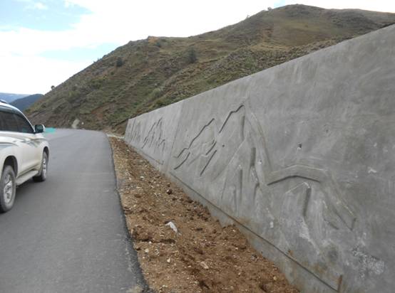 全線由于半填半挖路段較多,為減少上邊坡的碎落,結合大景區(qū)的打造,在全線采用了不同風格的上邊坡維護形式,有臺梯式擋墻、掛網植草、CF網植草、噴播植草、藝術上擋等等多種形式,讓游客在車行途中,抬頭看見的是生機盎然的景象。