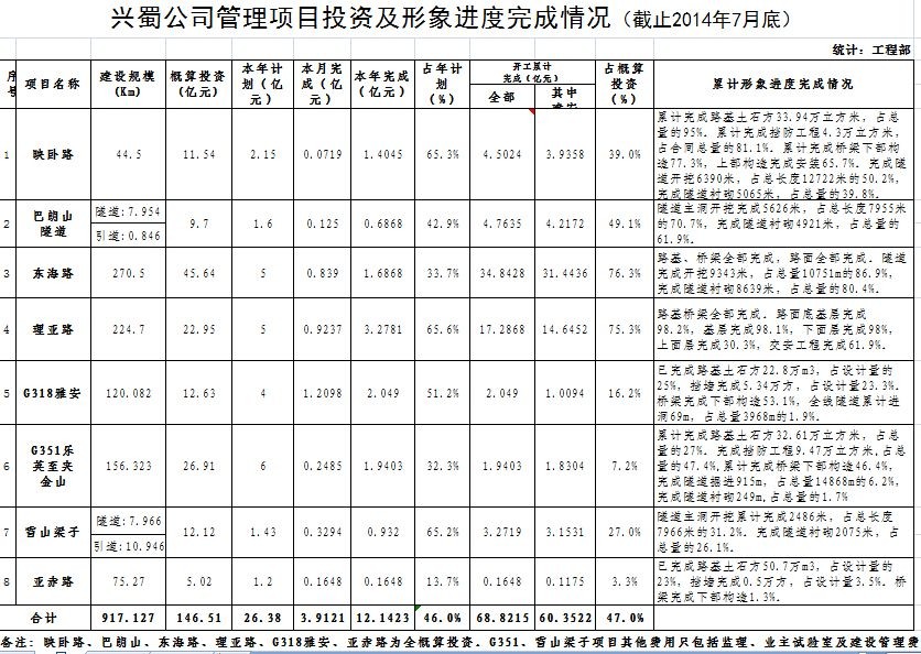 公司管理項(xiàng)目投資及形象進(jìn)度完成情況(截至2014年7月底)