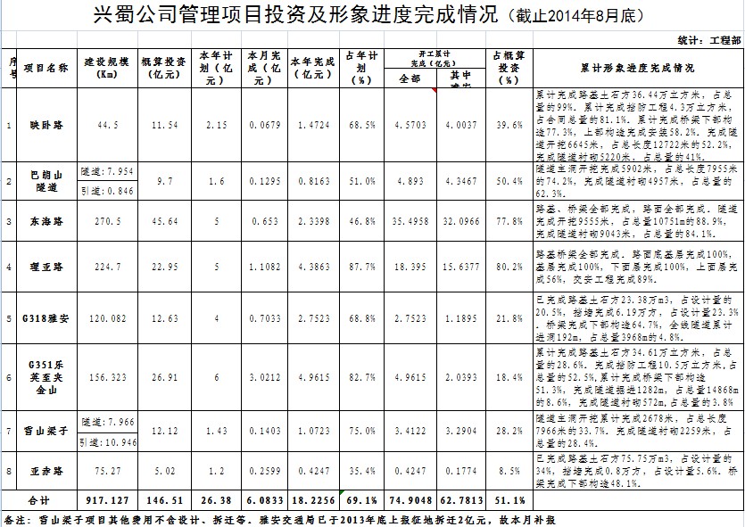 公司管理項目投資及形象進度完成情況(截至2014年8月底)