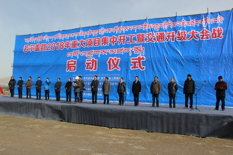 2018年3月20日,阿壩州若爾蓋縣委縣人民政府組織舉行2018年重大項(xiàng)目建設(shè)暨交通升級(jí)大會(huì)戰(zhàn)集中啟動(dòng)儀式,州、縣級(jí)領(lǐng)導(dǎo)等共計(jì)400余人參加。2018年,若爾蓋縣擬實(shí)施項(xiàng)目126個(gè),計(jì)劃總投資25.09億元,其中交通項(xiàng)目10個(gè),占總投資40%。