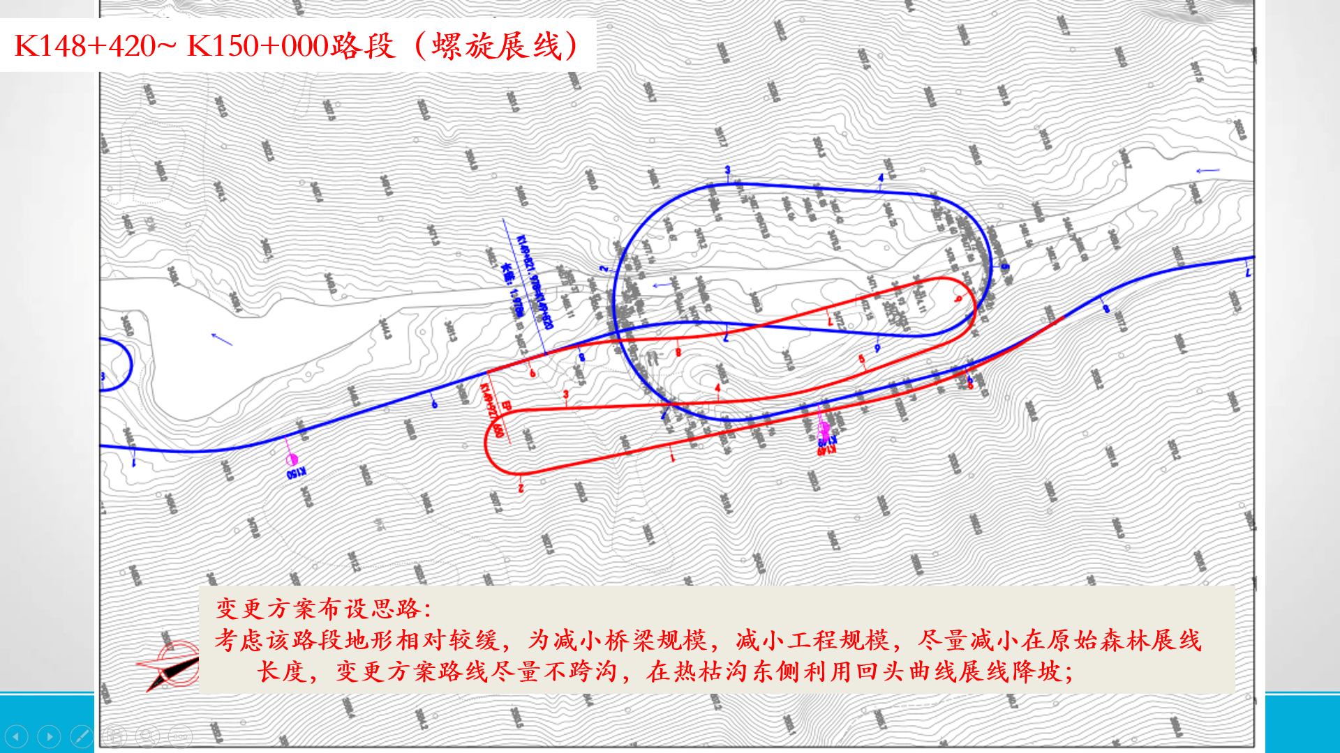 九石路指揮部在實(shí)地調(diào)研后力主將原設(shè)計(jì)螺旋橋改為“兩倒拐”的小半徑回旋橋+回頭線的變更。通過(guò)實(shí)施,避免了河對(duì)岸的原始森林遭到破壞,保護(hù)了該處既有景觀,也減小了由此造成山體垮塌等地災(zāi)隱患的發(fā)生可能。同時(shí)還節(jié)約了一千余萬(wàn)的造價(jià),為急需變更預(yù)留了資金空間。