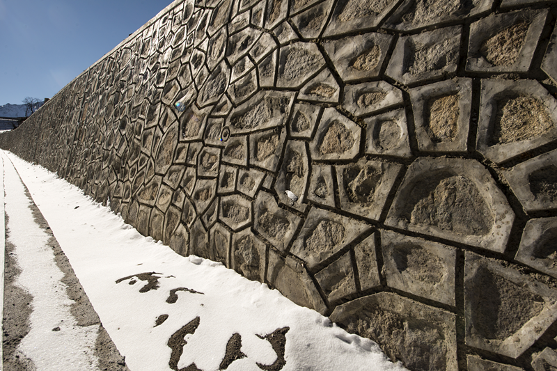 全線上擋漿砌片石嘗試了凹縫施工法,避免了皮帶縫砂漿在長(zhǎng)期高寒凍脹影響下出現(xiàn)脫落的現(xiàn)象,值得類似項(xiàng)目借鑒。墻頂采用砂漿皮帶壓頂?shù)淖龇ㄊ莾?nèi)地高速公路建設(shè)的另類延續(xù),提升了上擋的顏值。兩端嘗試了“倒棱”及“弧面”的漸變?nèi)肷椒绞健?