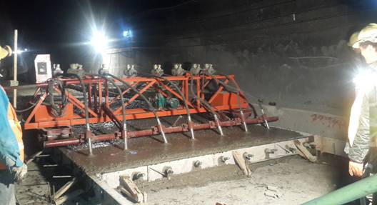 此次鋪筑機(jī)械主要采用了三輥軸混凝土攤鋪整平機(jī)、排式振搗器和抹平機(jī),模板采用了定型鋼模。