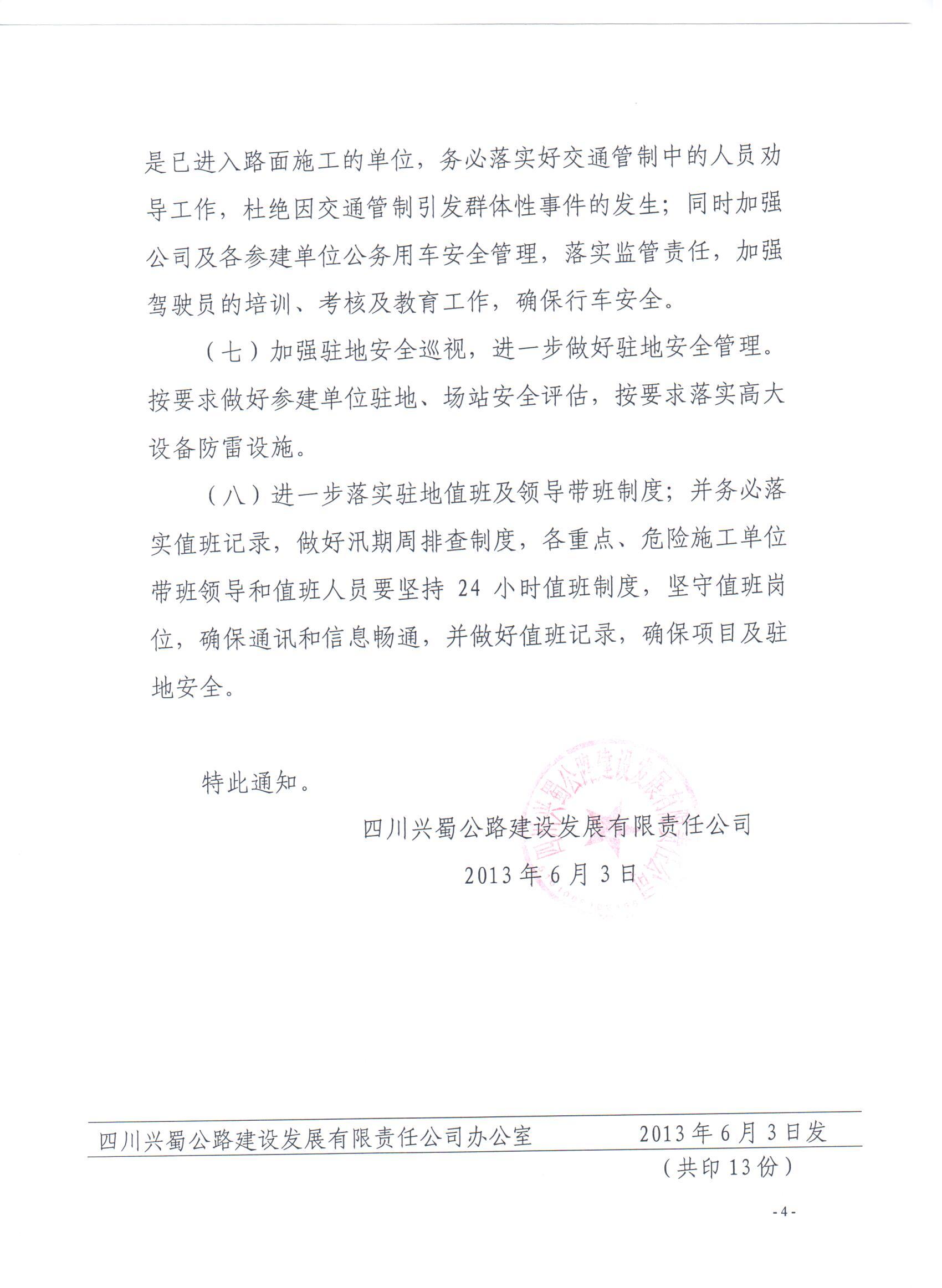 (六)加強交通安全管理,確保道路暢通及行車安全。進一步加強施工路段交通疏導,做好保通、保暢工作。特別是已進入路面施工的單位,務必落實好交通管制中的人員勸導工作,杜絕因交通管制引發(fā)群體性事件的發(fā)生;同時加強公司及各參建單位公務用車安全管理,落實監(jiān)管責任,加強駕駛員的培訓、考核及教育工作,確保行車安全。