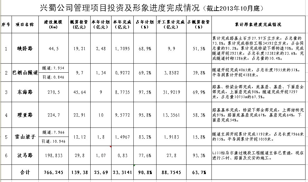 公司管理項(xiàng)目投資及形象進(jìn)度完成情況(截止2013年10月底)