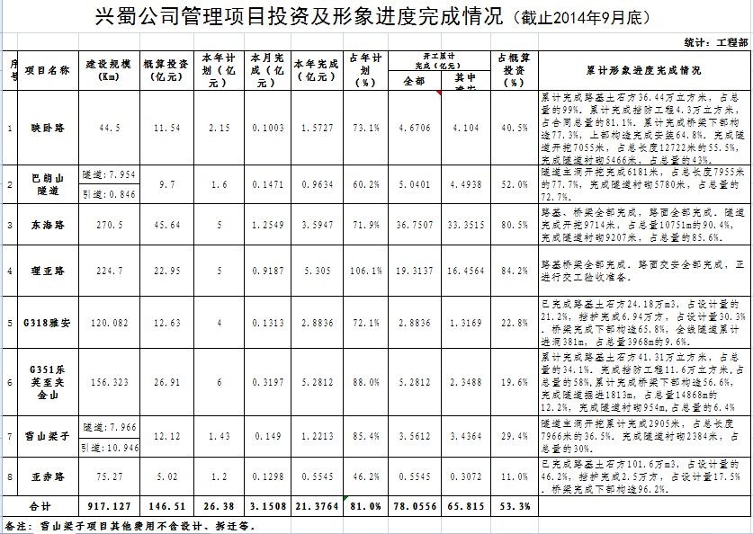 公司管理項(xiàng)目投資及形象進(jìn)度完成情況(截止2014年9月底)