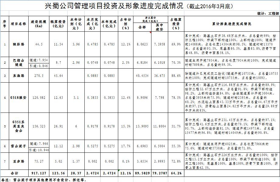 興蜀公司管理項目投資及形象進度完成情況(截止2016年3月底)