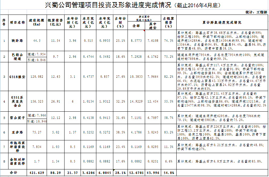 興蜀公司管理項目投資及形象進度完成情況(截止2016年4月底)