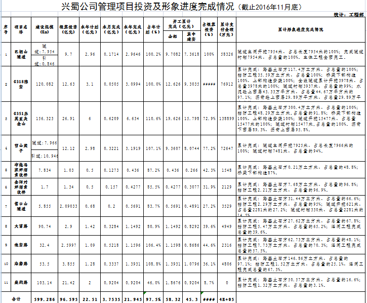 興蜀公司管理項(xiàng)目投資及形象進(jìn)度完成情況(截止2016年11月底)