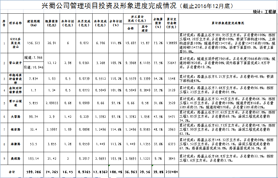 興蜀公司管理項目投資及形象進(jìn)度完成情況(截止2016年12月底)