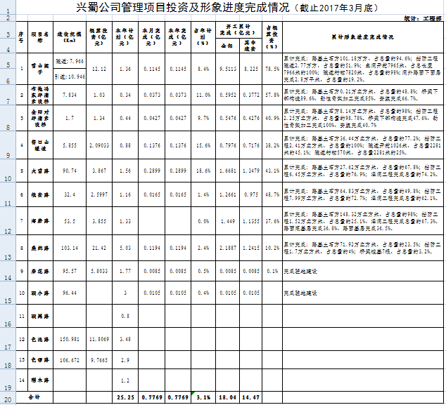 興蜀公司管理項目投資及形象進(jìn)度完成情況(截止2017年3月底)