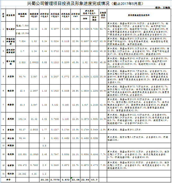 興蜀公司管理項目投資及形象進(jìn)度完成情況(截止2017年5月底)