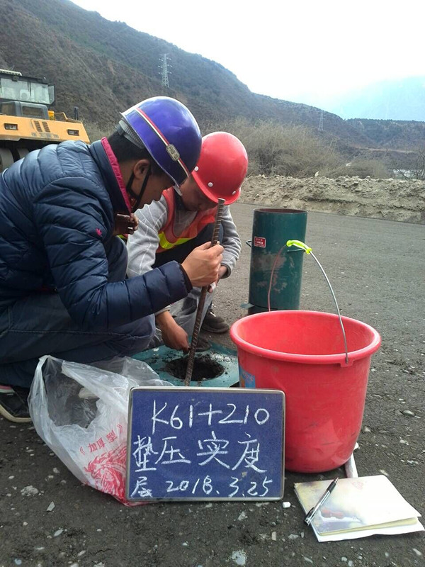 此次鋪筑K41+000~K41+200試驗(yàn)段,墊層頂面寬度8.2米,底面寬度8.5米,設(shè)計(jì)厚度0.15米。興蜀公司桑然路指揮部組織總監(jiān)辦、監(jiān)理實(shí)驗(yàn)室、施工單位完成原材料檢測(cè)、配合比設(shè)計(jì)、施工方案審核、施工測(cè)量放樣、混合料攤鋪、松鋪高程測(cè)定、橫坡平整度檢測(cè)等一系列工序后,采用攤鋪機(jī)鋪筑級(jí)配碎石墊層,經(jīng)20T鋼輪壓路機(jī)4遍碾壓、30T膠輪壓路機(jī)2遍碾壓,路面壓實(shí)度達(dá)到97%,級(jí)配碎石密實(shí)板結(jié),路面平整、線形順直,完全符合設(shè)計(jì)指標(biāo)要求,為桑然路下一步實(shí)施路面水穩(wěn)層攤鋪施工奠定了基礎(chǔ)。