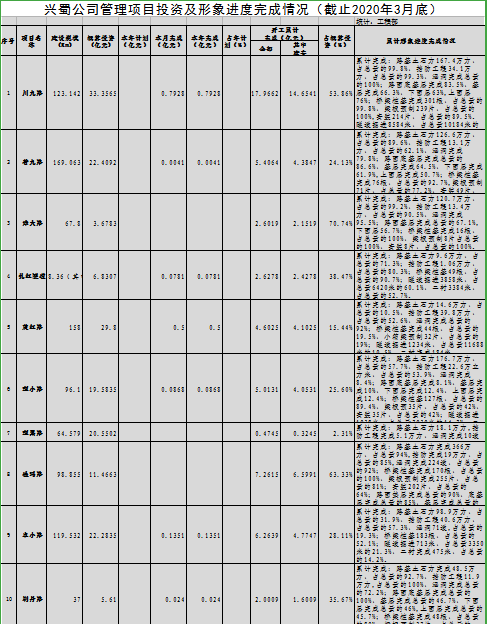 公司管理項目投資及形象進度完成情況(截至2020年3月底)