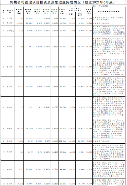 興蜀公司管理項目投資及形象進度完成情況(截至2021年6月底)