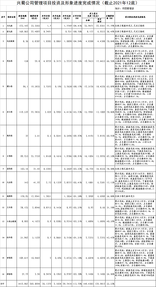 興蜀公司管理項目投資及形象進度完成情況(截止2021年12底)