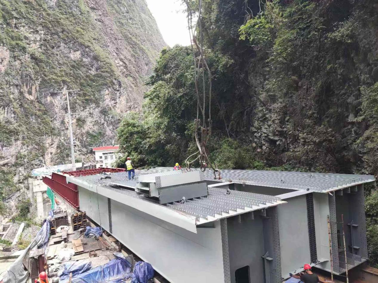 白水河大橋鋼箱梁施工采用液壓同步頂推滑移技術(shù),實(shí)現(xiàn)毫米級(jí)精準(zhǔn)落梁,達(dá)到了科學(xué)、高效、安全的目的。