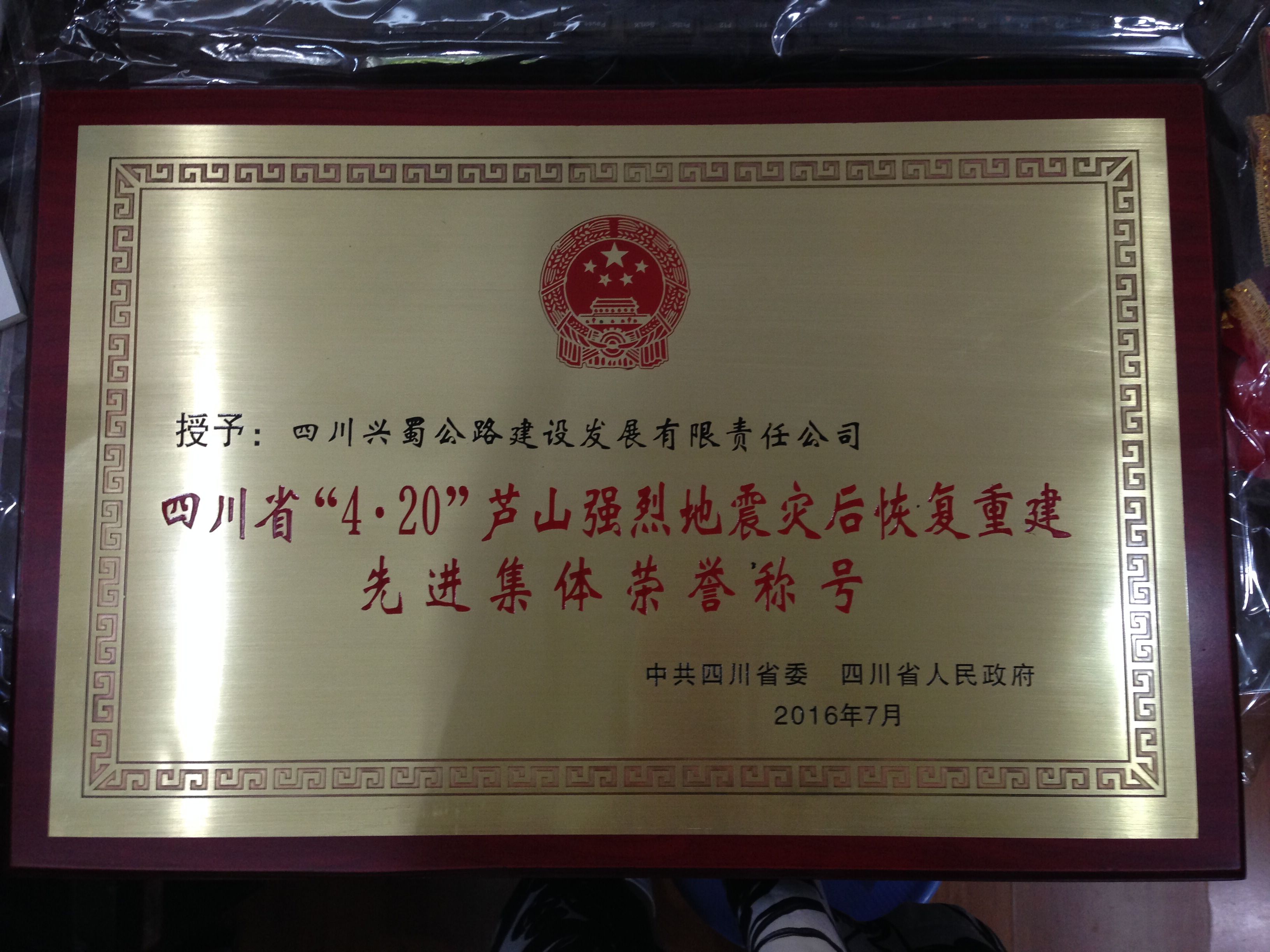 興蜀公司榮獲四川省“4.20蘆山強(qiáng)烈地震災(zāi)后恢復(fù)重建先進(jìn)集體”榮譽(yù)稱號